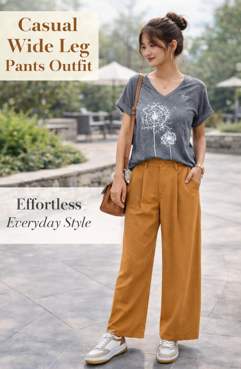 Looking for an easy outfit that feels comfortable and still looks stylish? This casual wide-leg pants outfit pairs a relaxed graphic tee with flowy trousers and sneakers for the perfect everyday look. Ideal for casual outings, weekend wear, or running errands in style. Save this outfit idea for a simple, chic look that keeps you feeling confident and effortlessly put together.