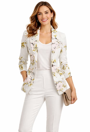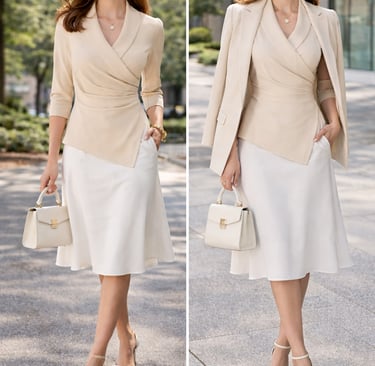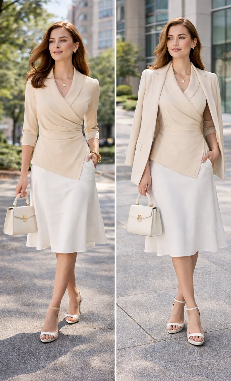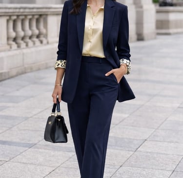 This refined business-casual outfit pairs a soft cream satin blouse with tailored navy trousers and a structured navy blazer for a timeless, confident look. The clean lines and neutral palette create an effortlessly professional silhouette, while subtle gold accessories and a black handbag add a touch of understated luxury. Finished with classic black closed-toe heels, this outfit is ideal for modern workdays, meetings, or any occasion that calls for polished simplicity with ease.