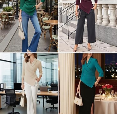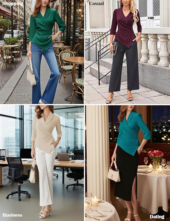 STYLISH DESIGN: Women's wrap V-neck 3/4 sleeve fall top has a ruched waist design that can accentuate your body curves. The asymmetric hem design is more unique and gives you an elegant feel. Elegant and simple, this casual elegant ruched work top is sure to be a window must-have. It will spark your imaginations for the endless mix and match potential.