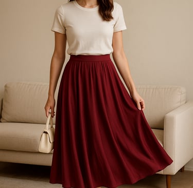 This beautiful matching skirt design featuring an elastic high waist and a flared A-line silhouette, this midi skirt provides a flattering, regular fit. The knee-length design is ideal for both professional and casual settings.