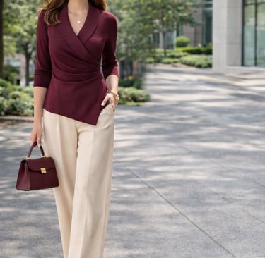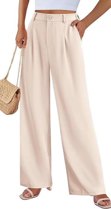 These beige wide-leg trousers are a true wardrobe workhorse—you can dress them up for the office with a wrap blouse and structured bag, or dress them down with a simple tee and flats for weekends. The tailored high waist flatters the shape, while the relaxed leg keeps the look comfortable and polished all day. Because the color is a soft neutral, they pair effortlessly with everything from bold tones (like burgundy or teal) to classic whites, blacks, and creams—so you’ll get endless outfits from one piece. It makes this wide Leg Dress Pants for Women suitable for any occasion.