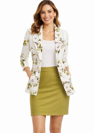 This outfit pairs a soft beige A-line skirt with a patterned short-sleeve blouse, creating a balanced look that feels both relaxed and refined.