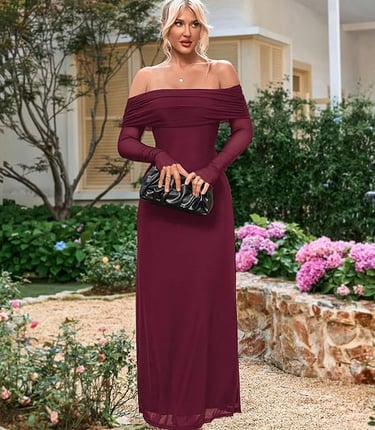 This deep wine-red off-the-shoulder gown is the kind of dress you choose when you want to feel unforgettable.